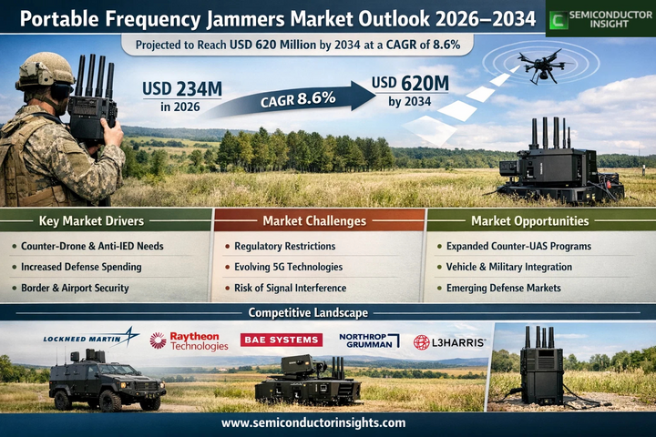 Global Portable Frequency Jammers Market was valued at USD 234 million in 2026 and is projected to reach USD 620 million by 2034, growing at a CAGR of 8.6% during the forecast period 2026–2034. Market momentum is being shaped by sustained defense modernization programs and expanding use of mobile electronic countermeasure systems across security operations.