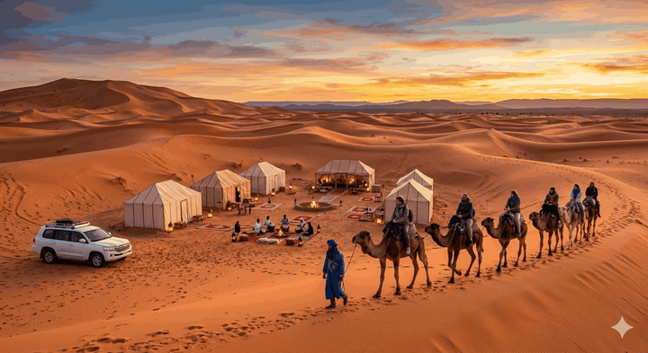 The most sought-after leg of any Moroccan circuit is the journey to the Sahara. This route typically involves crossing the High Atlas Mountains via the Tizi n'Tichka pass, a road that reaches an altitude of 2,260 meters. Along the way, travelers stop at the UNESCO World Heritage site of Ait Ben Haddou, a fortified village that represents the pinnacle of earthen clay architecture. The circuit then continues through the Dades Valley and toward the dunes of Merzouga. A professional itinerary ensures that the desert segment includes luxury "glamping" camps, where you can experience the profound silence of the dunes without sacrificing modern comforts like en-suite bathrooms and gourmet dining.