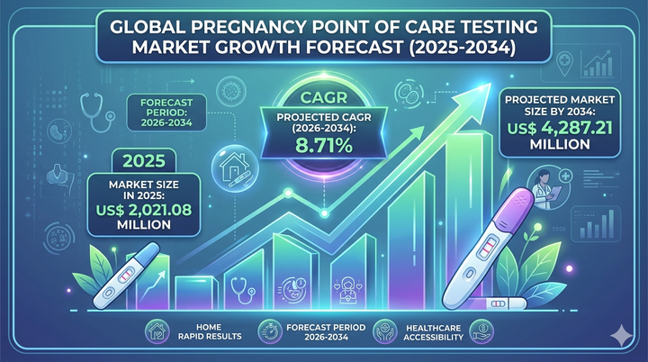 The global pregnancy point of care testing market size is projected to reach US$ 4,287.21 million by 2034 from US$ 2,021.08 million in 2025. The market is anticipated to register a CAGR of 8.71% during the forecast period 2026–2034. This growth is primarily driven by the rising demand for rapid diagnostic solutions, increasing awareness of early pregnancy detection, and expanding healthcare accessibility. The growing preference for home-based testing kits and advancements in diagnostic accuracy are further contributing to the steady expansion of the market across developed and emerging economies.