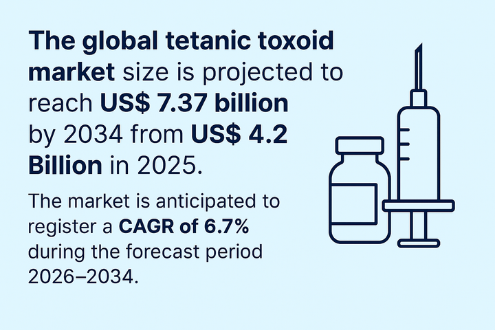 The Tetanic Toxoid Market is experiencing steady growth driven by increasing global immunization coverage and strong support from public health organizations. The global Tetanic Toxoid Market size is projected to reach US$ 7.37 Billion by 2034 from US$ 4.2 Billion in 2025. The market is anticipated to register a CAGR of 6.7% during the forecast period 2026–2034. A major trend influencing this growth is the rising adoption of combination vaccines, which simplify vaccination schedules and improve patient compliance. Furthermore, government initiatives and programs led by organizations such as WHO and UNICEF are accelerating vaccination efforts, particularly in low- and middle-income countries. Expanding healthcare infrastructure and improved access to immunization services are also contributing to market growth.